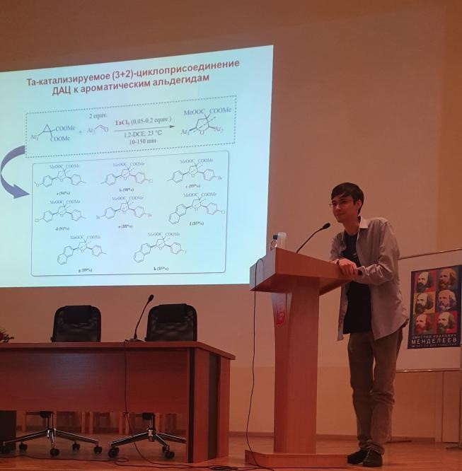 Третью премию разделили молодые ученые лаборатории органического синтеза и лаборатории химии углеводородов Гузель Ураловна Гильфанова с работой «Разработка гибридных биоактивных покрытий для металлических имплантатов на основе бисфосфонатов аминокислот, пептидов и гиалуроновой кислоты», и Айдар Булатович Юлбарисов с работой «TaCl5‑катализируемая реакция донорно‑акцепторных циклопропанов с ароматическими альдегидами: эффективный подход к синтезу замещенных тетрагидрофуранов».