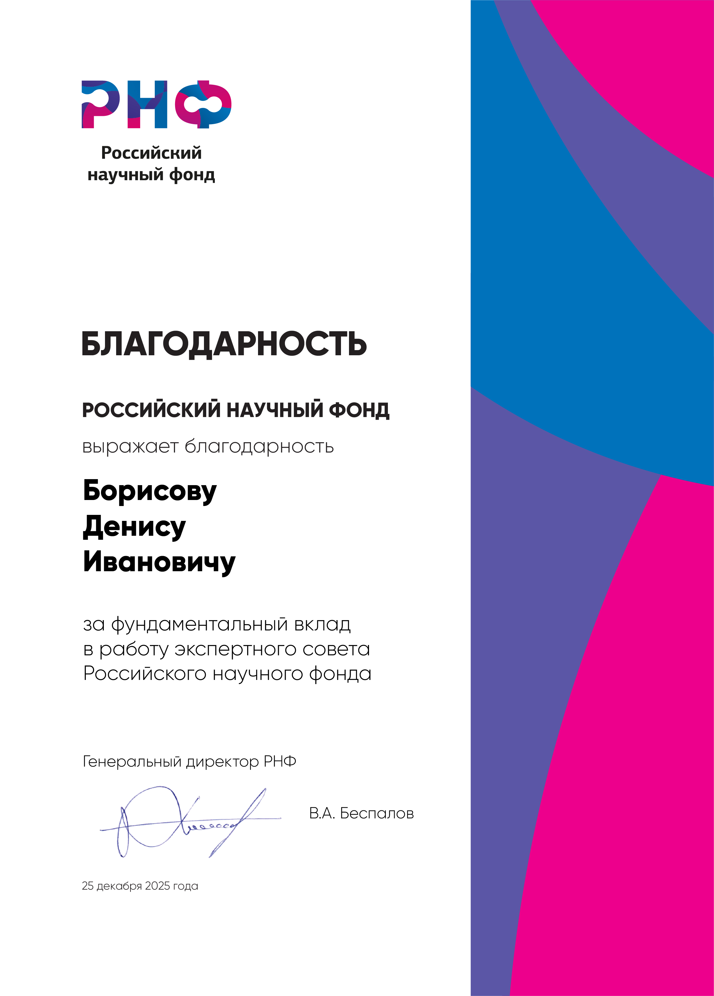 Российский научный фонд (РНФ) выразил официальную благодарность главному научному сотруднику Института математики с вычислительным центром УФИЦ РАН, и.о. заведующего отделом дифференциальных уравнений, доктору физико-математических наук Борисову Денису Ивановичу за фундаментальный вклад в работу экспертного совета РНФ.