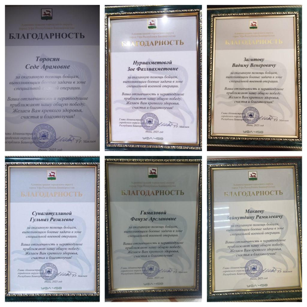 Кроме того, активисты нашего движения Гималова Ф.А., Торосян С.А., Нуриахметова З.Ф., Загитов В.В., Макаев З.Р., Сунагатуллина Г. Р. получили благодарности от администрации г.Уфа за активную работу и самоотверженность.