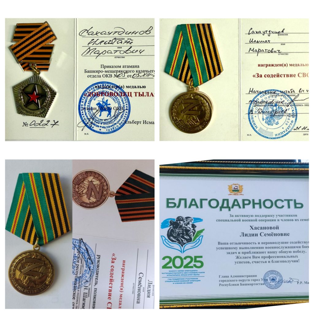 Медалями “За содействие СВО” награждены Хасанова Л. С. и Сахаутдинов И.М. Медалью “Доброволец тыла” также был награжден Сахаутдинов И.М. Эти медали вручаются гражданам и организациям за поддержку участников спецоперации, за участие в восстановлении территорий республик Донбасса и регионов Украины, пострадавших от боевых действий.