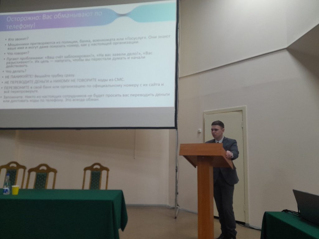 Затем с лекцией: «Осторожно мошенники: как не попасться?» выступил Низамутдинов Марат Марселевич – студент 3-го курса УУНиТ, специальность «Экономическая безопасность». Марат Марселевич рассказал об основных схемах мошенничества в отношениии пожилых людей (обман с использованием телефоной связи и интернет коммуникаций, сообщений в мессенджерах и др.). Им подробно были рассмотрены способы противодействия соврtменным мошенническим схемам.
