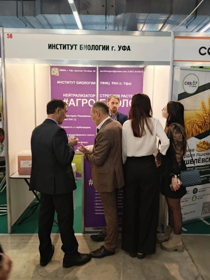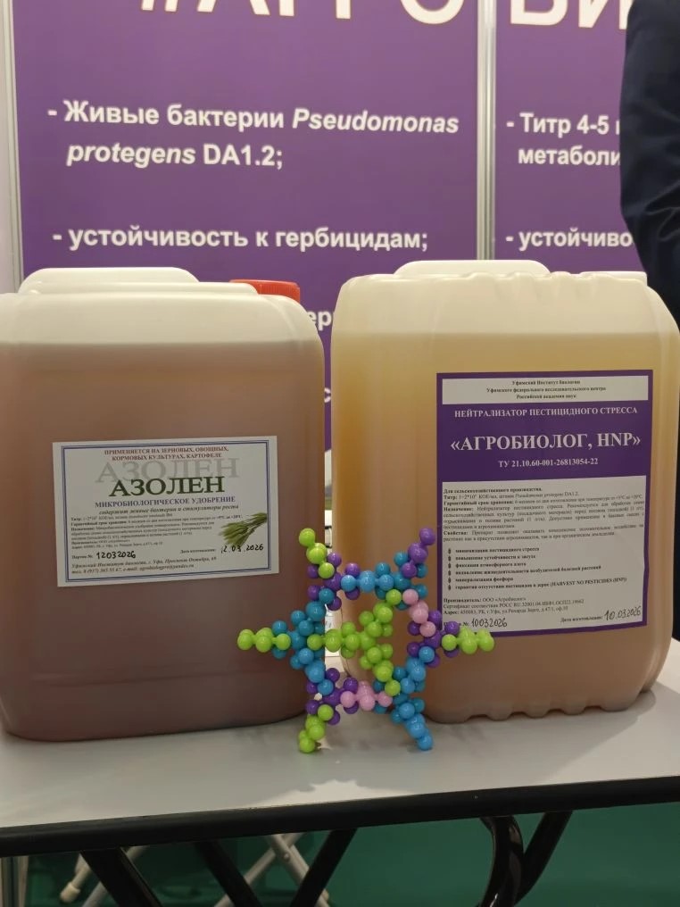Сотрудники лаборатории агробиологии Уфимского Института биологии УФИЦ РАН (заведующий д.б.н. Четвериков С.П.) приняли участие в проходившем в Уфе Агропромышленном форуме и 36 Международной специализированной выставке «Агрокомплекс» (17-20 марта 2026 г.). На выставке были представлены разработанные в Уфимском Институте биологии УФИЦ РАН биопрепарат-нейтрализатор гербицидного стресса «Агробиолог» и биоудобрение «Азолен»®.
