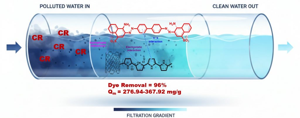 В рамках данного исследования разработаны новые нанокомпозитные материалы на основе полипиррола (PPy) и ленточных углеродных нанотрубок (R-CNTs). R-CNTs были синтезированы экономичным методом термического химического осаждения паров пентана при 650 °С с использованием 2-этилгексаноата никеля в качестве катализатора. Нанокомпозиты PPy/R-CNTs (соотношения 80/20, 50/50, 33/67) получены методом окислительной полимеризации in situ. Исследована адсорбционная активность композитов по отношению к конго красному (CR), высокотоксичному и устойчивому азокрасителю. Выявлена высокая селективность композитов PPy/R-CNTs, обеспечивающая до 96% удаления CR при начальной концентрации 60 мг/л в условиях комнатной температуры. Адсорбционное равновесие было достигнуто в интервале 8-12 ч, при этом кинетика процесса хорошо описывалась моделью псевдовторого порядка. Данные изотерм адсорбции соответствовали модели Ленгмюра, демонстрируя максимальную сорбционную емкость в диапазоне 276.94-367.92 мг/г. Полученные композиты продемонстрировали высокую стабильность, сохраняя эффективность удаления CR на уровне 96% после трех циклов регенерации, что подтверждает их пригодность для многократного использования.